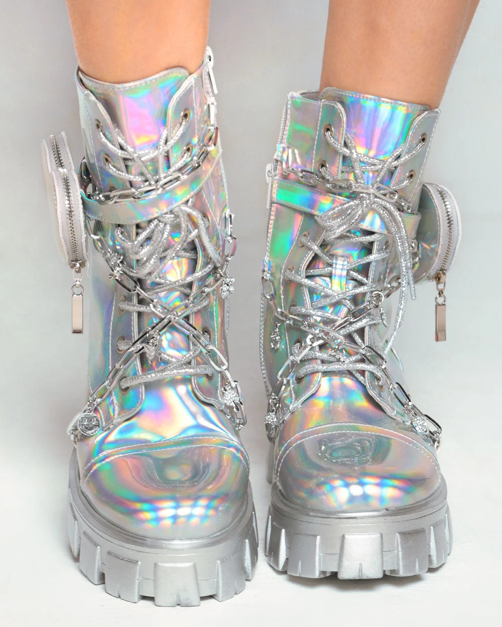 Tell a cosmic story with the Dreamy Dazzle Holo Combat Boots With Charms & Heart Pocket! These kicks feature an iridescent construction, lace-up design, and an adorable heart-shaped mini pouch.