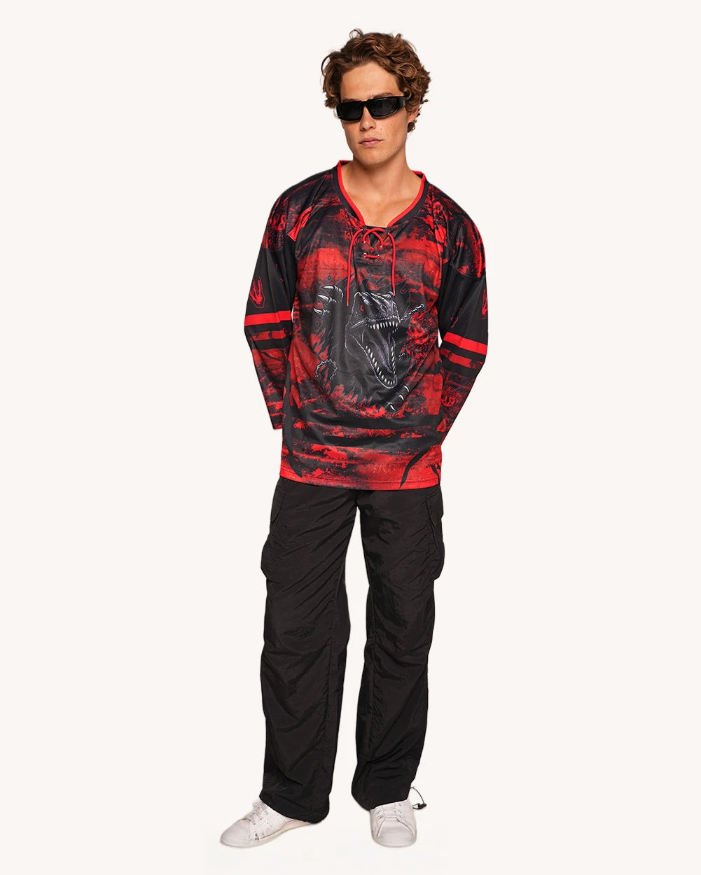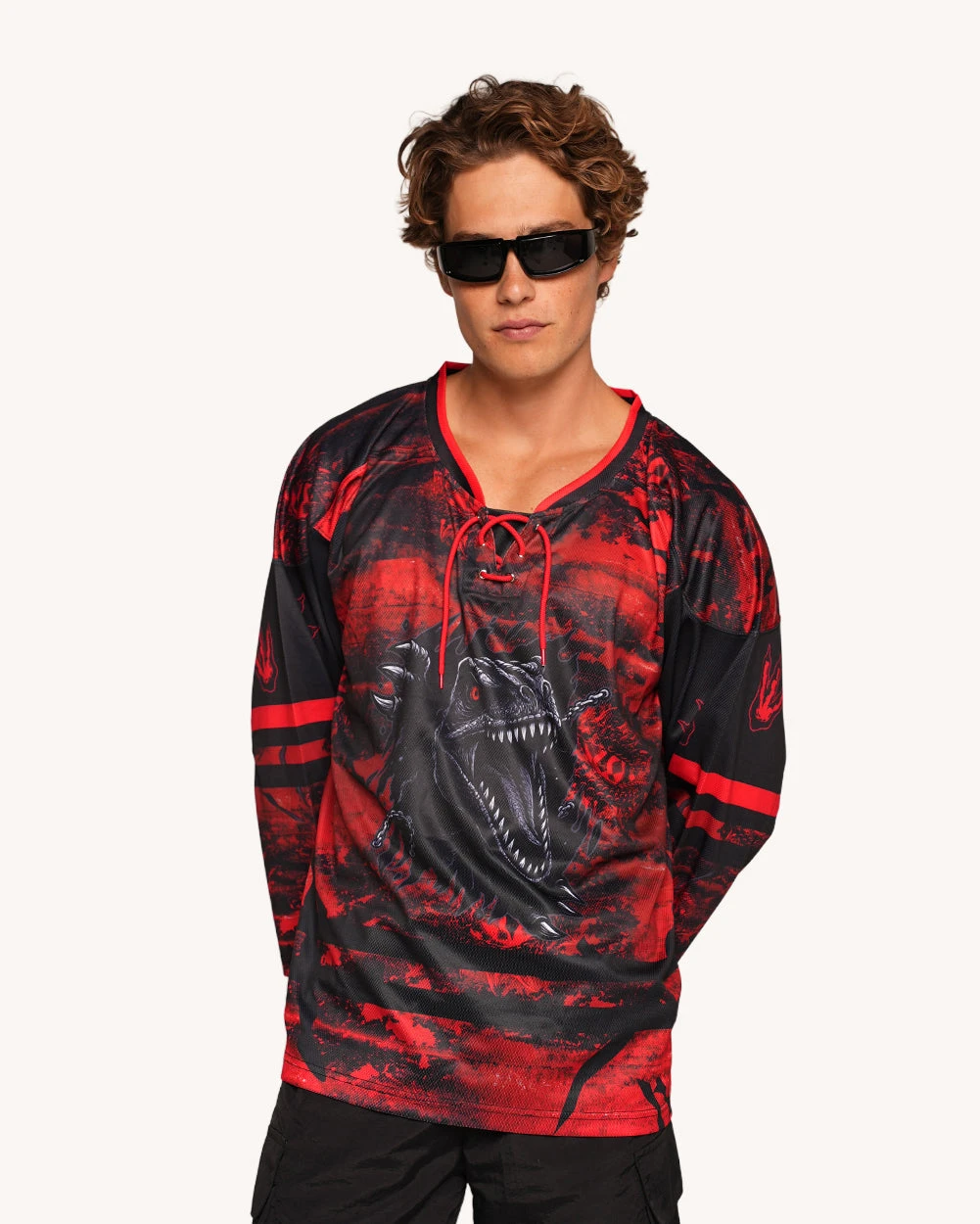 The Earthshaker Jersey is not for the faint of heart. With a blood-red lava print, front-and-center roaring dino graphic, and varsity-inspired lace-up neckline, this unisex top screams prehistoric power.Â
