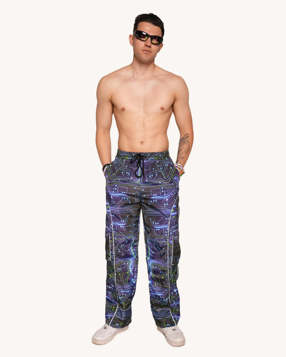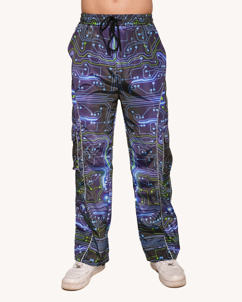 The Electric Void Pants are serving cyber raver with futuristic vibes! Glitch into another realm with their circuit-breaking print that radiate endless beats and neon dreams.
