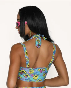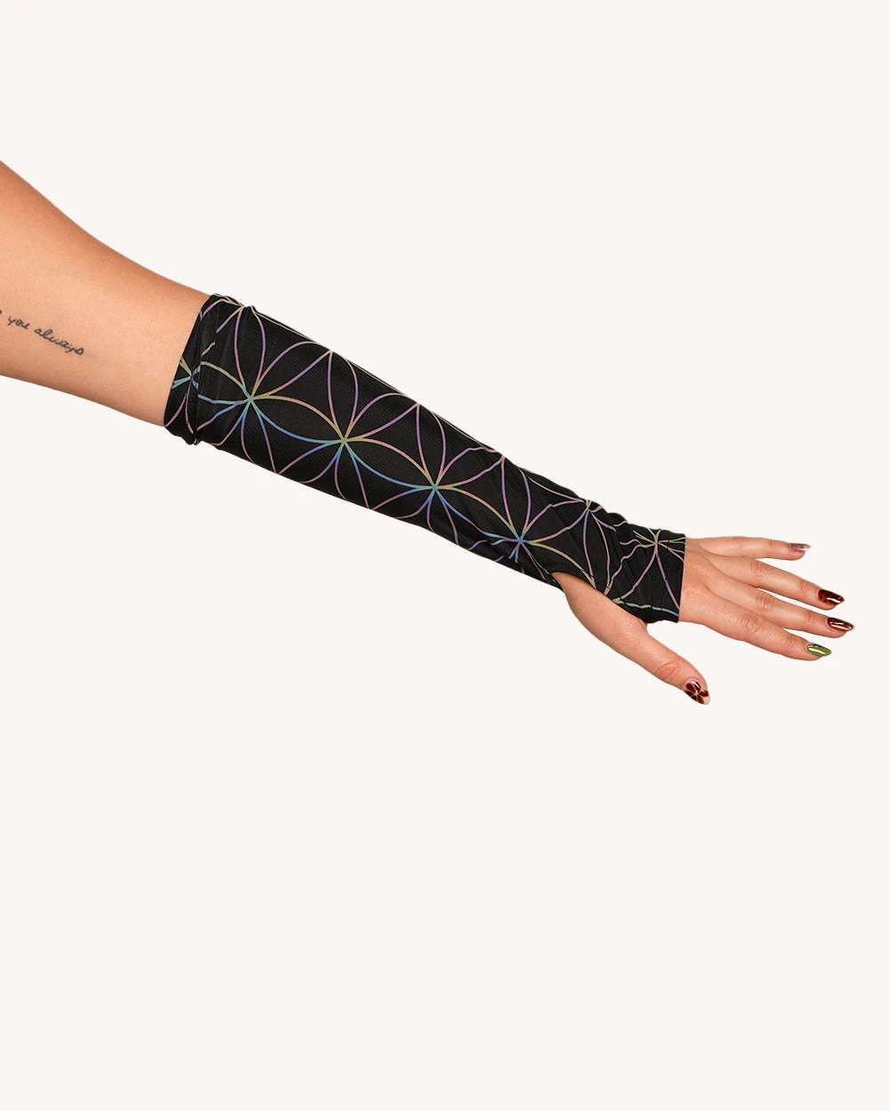 Keep your frequency high with the Glowkeeper Rainbow Reflective Top with Sleeves! This trippy top feature a double-strap design and a mesmerizing geometric print that pulses with rainbow energy under the lights.Â
