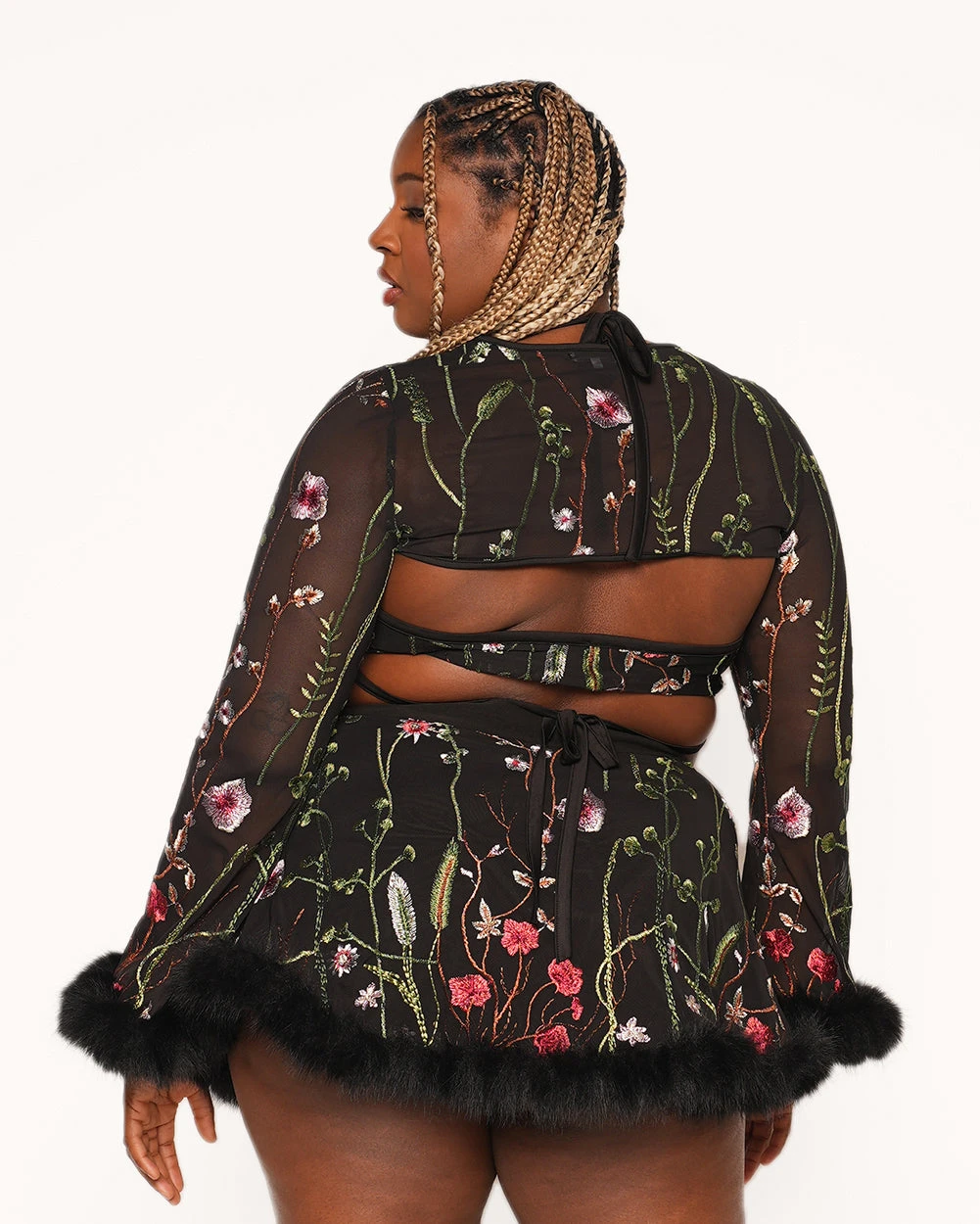 Twirl through desert fields with the Lace Flowerfields Stretch Marabou Ultra Crop Top 2.0! This ethereal dream features delicate floral lace and a flowing bell sleeve design with marabou trim. Pair it with its matching top and skirt for a goddess-worthy look that blooms with every step.Â