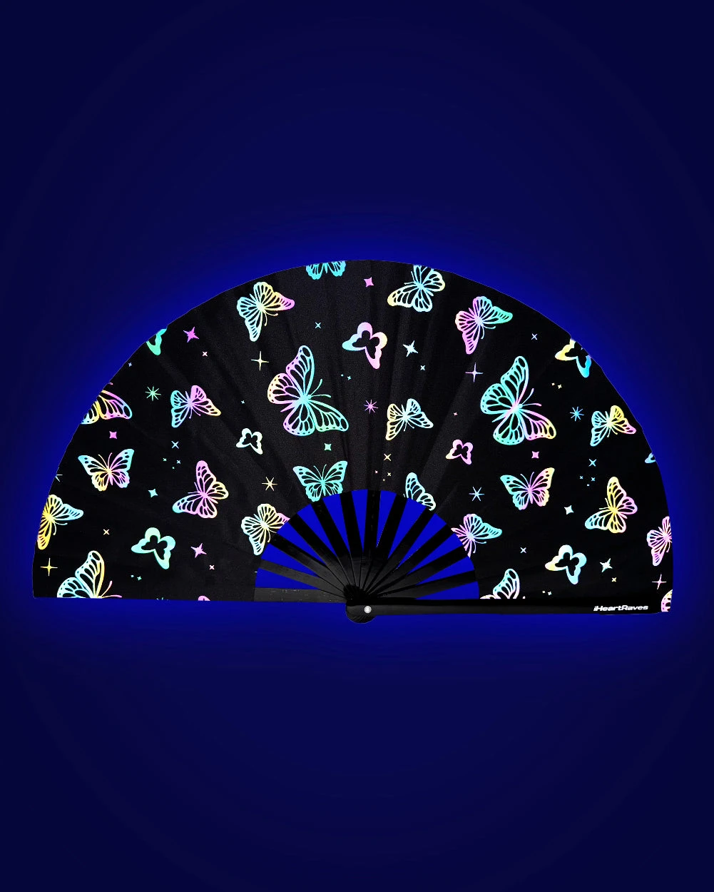 Float through your next weekend bender with the Lucid Flight Rainbow Reflective Hand Fan! This mesmerizing rave essential features neon-hued butterflies that come to life under the lights, creating a trippy, iridescent glow.Â